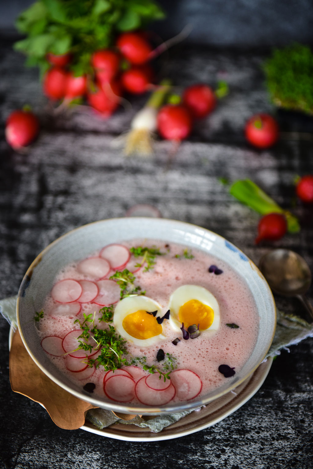 - Die Suppe mit Salz und Pfeffer abschmecken. Auf Suppenteller verteilen. Die Eier pellen, halbieren und auf die Suppe setzten. Mit den Radieschenscheiben und Kresse toppen. Stay fresh!